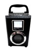 EQ-27 Features: * Support USB memory and SD/MMC card * FM radio function * MP3 format decoder * LCD display, can display play time, volume, battery capacity & FM channel when open * LINE-IN function, work with all audio sources with a 3.5mm jack * Built-in rechargeable battery * Remote control * Volume control * Preset EQ * Power LED indication and battery charging indication Specifications * Power Supply: DC 5 Volt(li-lion Battery inside) USB power cord * Output Power: 3W*2 * Driver Unit: 4ohms * Frequency Response: 150-18KHz Packing : color box * Packing Content: Speaker, remote control,USB Power Cord, 2 head 3.5mm stereo cable